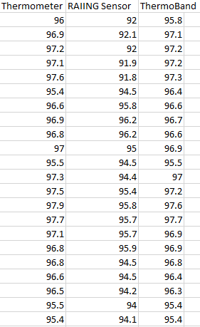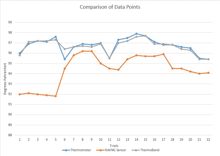 GraphAs shown from the line chart above, our "ThermoBand" is much more accurate in relation to the thermometer than competing brands (RAIING Sensor). Vivian 10/11/13 9PM: Almost forgot. Credits to John for editing and filming the video.