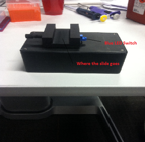 Make sure to adjust the slide so that the blue fluorescent light is shining through the drop.