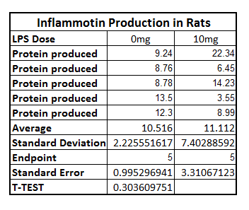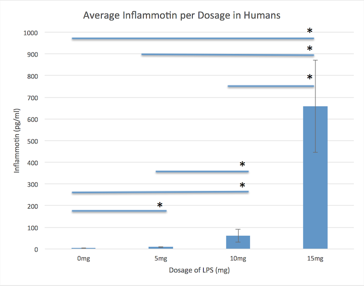 ResultsAbove is the graph of the average Inflammotin produced per human subject for each dosage. The graph also includes error bars, which show how the data varied. The error bars are increasing and offset so we can infer that the data is significant. The graph for the average Inflammotin produced in rats as a result of LPS dosage shows that the dosage has no effect on the production. Also, the error bars show that the Inflammotin production varied greatly within each dose therefore the data shows no significance.
