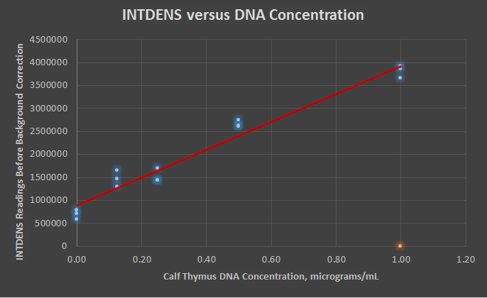 The graph above establishes the relationship between the integrated density (INTDENS) readings before background correction and the calf thymus DNA concentration in micrograms per milliliter. The integrated density is the sum of independent, noninteracting subsystems that hold proportional to the amount of material in the substance paralleled in observation of the direct relationship between the integrated density and the concentration of the calf thymus DNA.