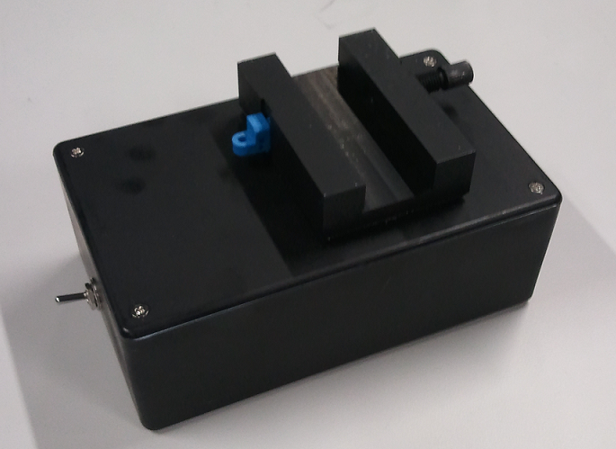The Fluorimeter pictured above was the device used for this lab. The gap in the middle-right is for a hydrophobic slide to be inserted and then slid into position. The desired position results in the beam of light being passed through the drop of liquid. The toggle switch on the left controls the beam of light.