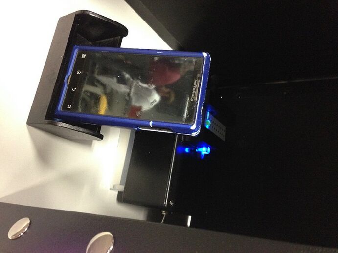 First, we placed the smart phone in the cradle given to us, then adjusted the vertical distance by adding slides beneath the fluorimeter. After getting the height between the fluorimeter and the camera in line, we placed the phone to focus on the drop and in return capture a clear image.