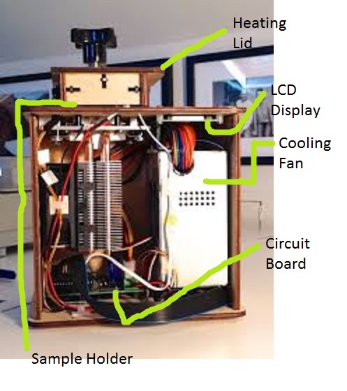 When we unplugged LED display from the Brain Board, the machine began flashing and fluctuating several different patterns, numbers, and letters on the LED display. When we unplugged the white wire that connects Brain Board to the LED display, the machine loses the ability to take the correct temperatures and went from the starting temperature in Celsius down about sixty degrees. Test Run On October 23rd, 2013, at approximately 10:17 AM, the OpenPCR machine was started and ended at about 11:35 due to the time limits. The time remaining in the machine's cycle was about 35 minutes. When working with this machine we did experience some flaws in the construct such as loose panels and hard to reach places. Also the small screws did not have the nut to go along with most of them. This left the walls of the machine unstable and not secure when examining the machine. Other than those minor flaws, our experience with the OpenPCR machine was quite satisfying.