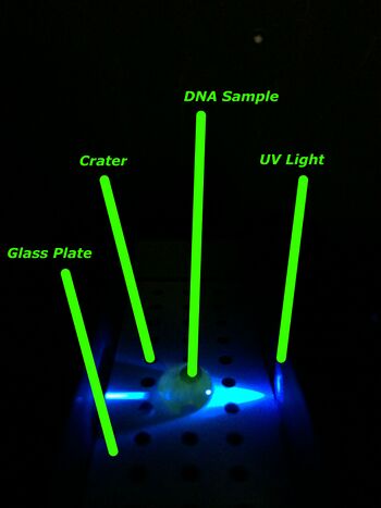 The technique used for the fluorescence is brought out when the correct enzyme is in the DNA sample. For a clearer picture of the sample, the box was shut to enhance the quality of the photograph. A phone was place on the bench with the flash off and the timer was set to 10 seconds to have time to focus and sharpen for a better picture. Three pictures were taken for each sample to ensure that there was a clear picture. It was repeated for each sample 3 times, but on the next section of craters of the glass plate.