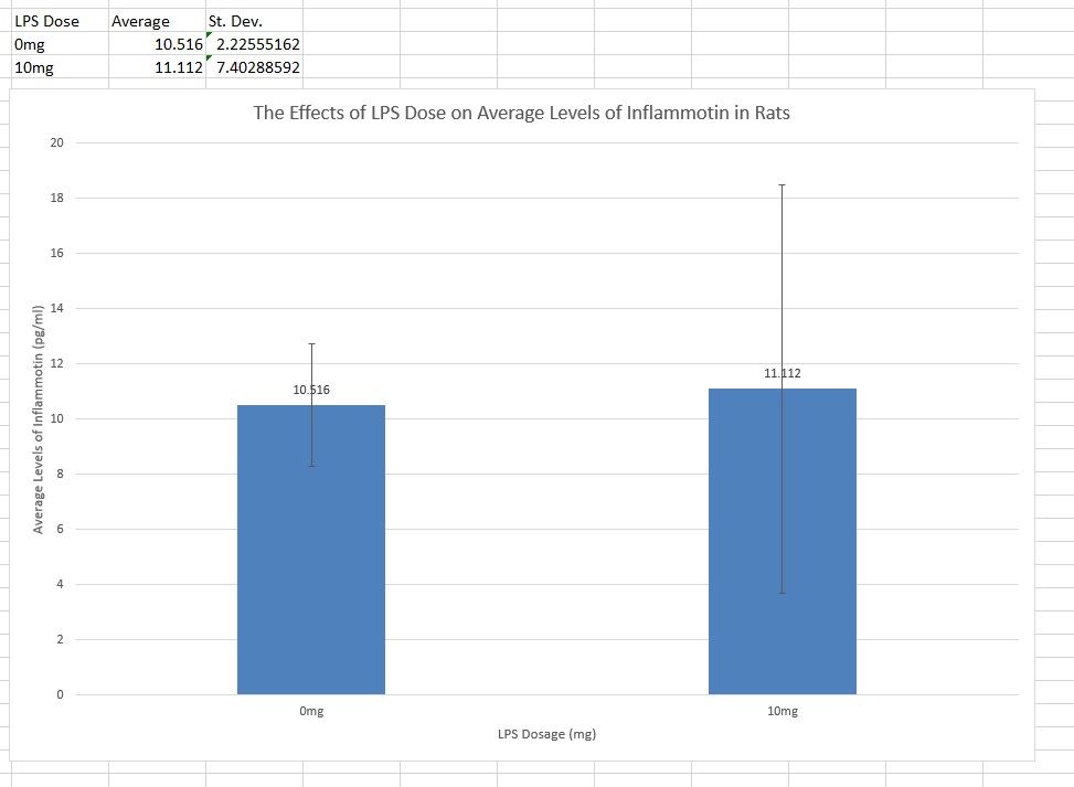 The data consisted of results from only 2 different groups (0mg and 10mg doses), so a T-test was run to find the p-value. The test yielded a p-value of 0.867403497, which means that the experiment had a percent uncertainty of about 86.7%. This is much higher than the accepted 5% (or a p-value of 0.05), which means that the results were not statistically different between groups. This leads to the conclusion that giving rats the LPS did not increase Inflammotin levels.