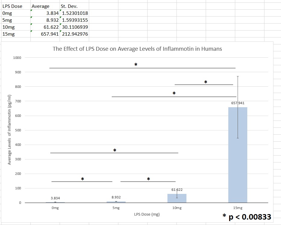 The data consisted of results from 4 different groups of subjects (0mg, 5mg, 10mg, and 15mg doses), so a one-way ANOVA test was run to find a p-value. The test yielded a p-value of 1.4 x 10-16, which means that the experiment had a percent uncertainty of less than 0.01%. This is much lower than the accepted 5% (or a p-value of 0.05), which means that the results were statistically different between groups. This leads to the conclusion that different dosages of the LPS will produce significantly different levels of Inflammotin in humans.