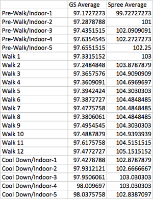 AnalysisTemperature P-Value: 0.5 The T-Test for temperature shows that the data is not significant because the p-value is greater than 0.5. This means there is not a significant differnce between the two devices. Heart Rate P-Value:0.5 The T-Test for heart rate shows that the data is not significant because the p-value is greater than 0.5. This means there is not a significant differnce between the two devices.