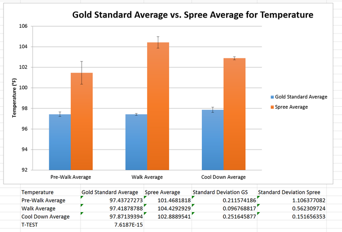 However, the values obtained from the T-test for the temperature calculations were not significant (percent error=7.6187E-15). The Pearson correlation was far from 1 (Pearson's R=-0.02886) because the temperature measurements given by the spree were different from the gold standard temperatures. This indicates that the Spree sensor and app have critical flaws that need to be fixed in terms of temperature readings.