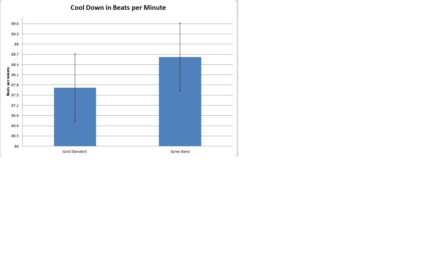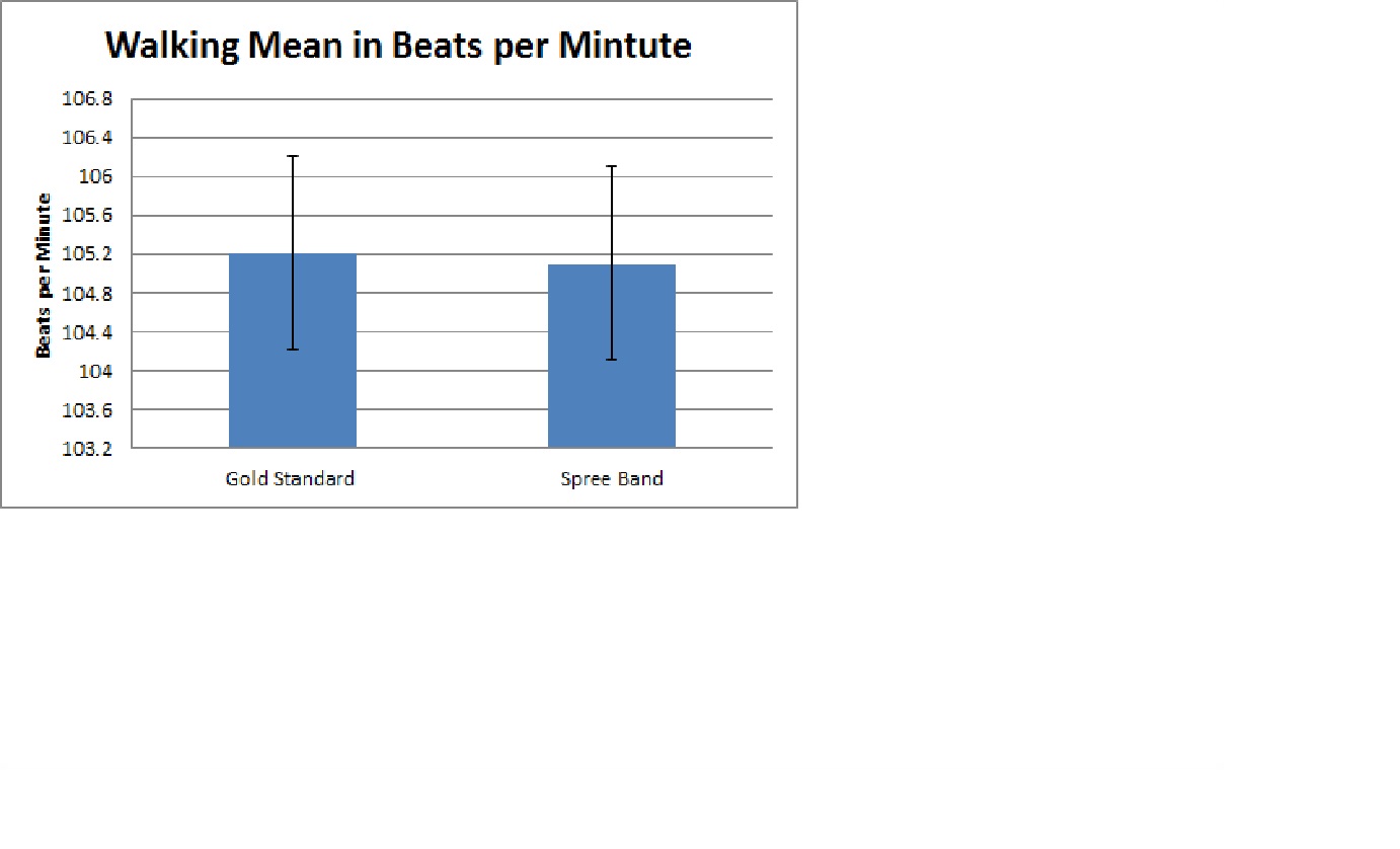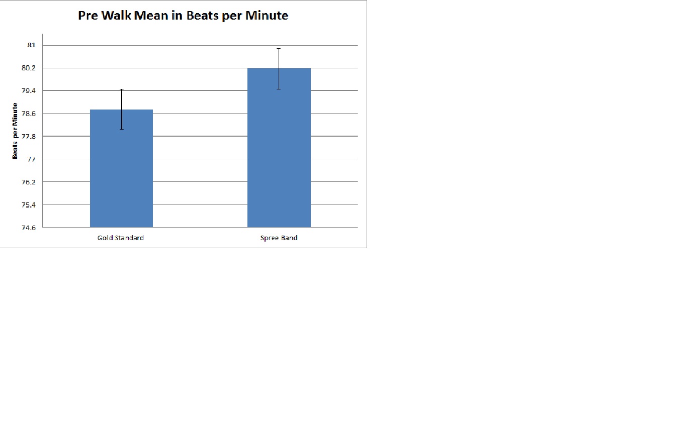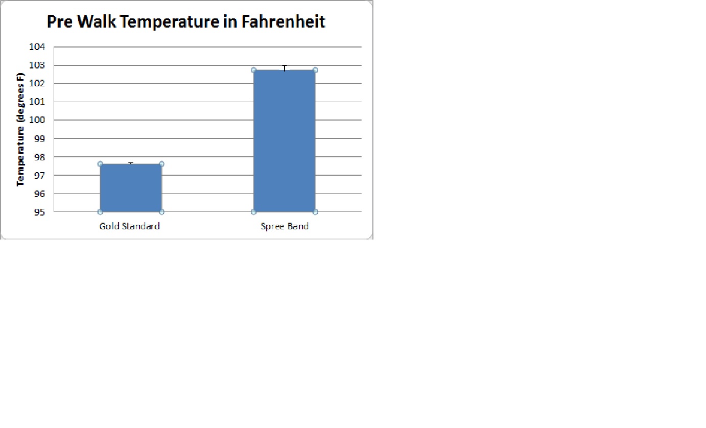 AnalysisBecause there are two groups being studied, the appropriate test is a t-test: Pre-walk Gold vs. Spree [Heart Rate] p = 0.4287, not statistically significant Walk Gold vs. Spree [Heart Rate] p = 0.9460, not statistically significant Post-walk Gold vs. Spree [Heart Rate] p = 0.6644, not statistically significant However, for all measurements comparing the gold standard thermometer to the Spree our p value was less than .05 and thus statistically significant. This would indicate that while the Spree headband does not produce statistically significant values from the gold standard for Heart Rate, it would for the thermometer, emphasizing the conception that the temperature monitor is not incredibly accurate. This seems to suggest that the Spree headband provides comparable results to the heart rate monitor, and could reliably measure heart rate.