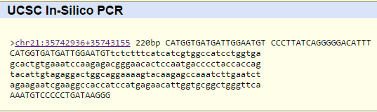 When testing the disease forward and reverse primers in the UCSC In-Silico PCR Search, the non-disease primers returned a perfect match with genome that was already on record (see Figure 1 below). This is because it was the control, the primers being targeted towards the normal, non mutated human gene, producing a perfect match with the non mutated gene on record.
