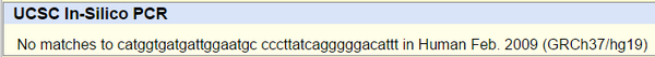 When testing the forward and reverse primers that contained the single mutation associated with Long QT syndrome, the UCSC search returned no matches (see Figure 2 below). This is because the forward primer, with its single nucleotide change, did not meet the 20-nucleotide perfect match minimum of the search to be considered a match against the normal, non mutated human gene.