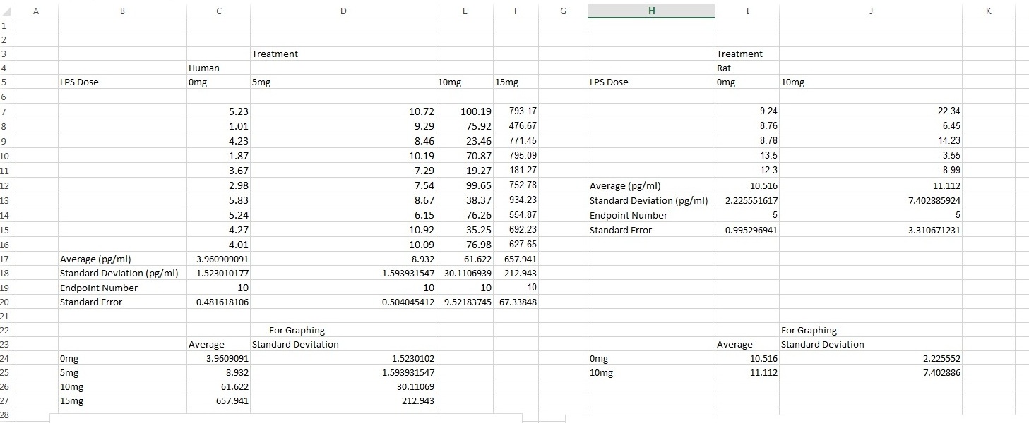 OUR TEAMLAB 2 WRITE-UPDescriptive StatisticsExperiment 1  The standard deviation for rats given a dose of 0 mg of LPS was 2.225551617 pg/ml. The standard deviation for rats given a dose of 10 mg of LPS was 7.402885924 pg/ml. The standard error for rats given a dose of 0 mg of LPS was 0.995296941 pg/ml. The standard error for rats given a dose of 10 mg of LPS was 3.310671231 pg/ml. Experiment 2 The standard deviation for humans given a dose of 0mg of LPS was 1.523010177 pg/ml. The standard deviation for humans given a dose of 5mg of LPS was 1.593931547 pg/ml. The standard deviation for humans given a dose of 10mg of LPS was 30.11069386 pg/ml. The standard deviation for humans given a dose of 15mg of LPS was 212.9429762 pg/ml. The standard error for humans given a dose of 0mg of LPS was 0.481618106 pg/ml. The standard error for humans given a dose of 5mg of LPS was 0.504045412 pg/ml. The standard error for humans given a dose of 10mg of LPS was 9.521837451 pg/ml. The standard error for humans given a dose of 15mg of LPS was 67.33848166 pg/ml. ResultsExperiment 1