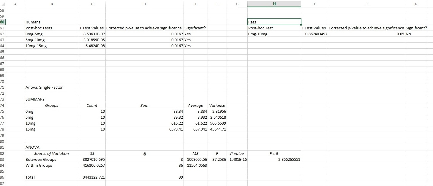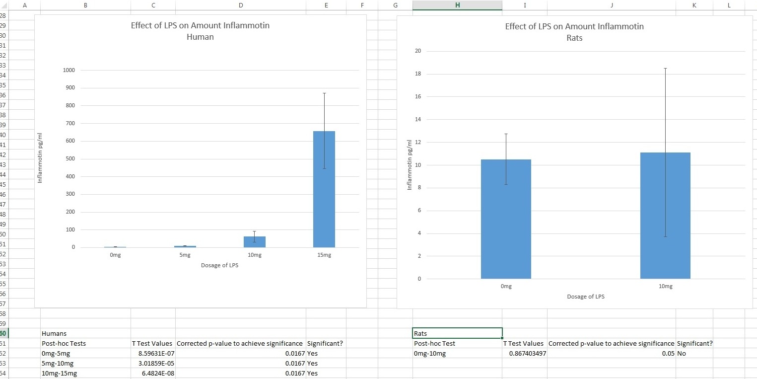 Anova: H0= There is no difference in inflation levels between the elderly group with the LPS dose of 5mg, 10mg, 15mg, and the control group with the LPS dose of 0mg. Ha=There is a difference in inflation levels between the elderly group with the LPS dose of 5mg, 10mg, 15mg, and the control group with the LPS dose of 0mg. T-tests: H0= There is no difference in inflation levels between the elderly group with the LPS dose of 5mg and the control group with the LPS dose of 0mg. Ha=There is a difference in inflation levels between the elderly group with the LPS dose of 5mg and the control group with the LPS dose of 0mg. H0= There is no difference in inflation levels between the elderly group with the LPS dose of 5mg and 10mg. Ha=There is a difference in inflation levels between the elderly group with the LPS dose of 5mg and 10mg. H0= There is no difference in inflation levels between the elderly group with the LPS dose of 10mg and 15mg. Ha=There is a difference in inflation levels between the elderly group with the LPS dose of 10mg and 15mg. Summary/DiscussionIn order to perform a 2 sample t-test, we are assuming that the selection of the subjects was completely random and unbiased and each sample is independent from every other sample. Additionally, the sample size of both rat and humans are assumed to be less than 10% of the population, in order to ensure there is the same probability of picking a random person in the population and we assume the data has a normal distribution. In the ANOVA test run on the human data, the p-value was 1.401*10^-16, meaning that there was a high difference between at least one data set and it was nearly impossible that the data occurred randomly. Using T-tests in the human data, we determined that the data was significant in humans, meaning that there was a low chance of the same data occurring randomly. Since our p-value of 8.59631E-07(0mg vs 5mg), 3.01859E-05(5mg vs 10mg) and 6.4824E-08(10mg vs 15mg) were less than our alpha level of .0167, therefore we reject our null hypothesis, we can conclude that there is a statistical difference between each dose in human trials. If the LPS does was ineffective there would be a 1.67% probability that the data was made by random chance. In rats however, there was no significance. Even though they were given a dose of LPS, there was no data to support that there was an increased amount of Inflammotin when compared to each dosage of LPS. This means that in the elderly, an increased amount of inflammation will most likely increase the amount of the protein Inflammotin. In the rats, since our p-value of 0.867403497 is lower than our alpha level of .05, we fail to reject our null hypothesis since there is no evidence to support that an increased amount of inflammation causes an increased amount of Inflammotin. It is interesting that the test on humans were significant, yet the tests done on rats were insignificant. The two tests are linked in that they were both done in a similar manner, but the data shows that rats react differently to inflammation, and did not produce more of the Inflammotin protein. This could be due to a difference in anatomy, or a different protein that rats use instead, or it could even be a lack of testing on the rats. Since fewer trials were done on them, the result was that there was more probability of it occurring randomly. However, we can conclude from the data that there is a correlation between an increase in LPS dose and an increase level of Inflammotin in human trials only. . | |||||||
