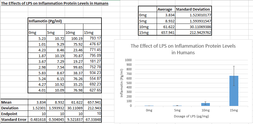 - For the humans we had four groups that were given 0 mg, 5 mg, 10 mg, and 15mg of LPS. We used an ANOVA test because there are multiple groups and the ANOVA test showed the p-value of 1.4x10^-16 which is less than .05 therefore the results are conclusive that there is a change of proteins. Therefore our data suggests that in rats the 0 mg and 10 mg dosage do not produce significant results and in humans the difference did not produce significant results suggest that rats given LPS are not affected by LPS unlike humans.
