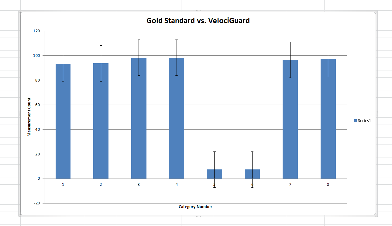 The overlapping error bars indicate the VelociGuard's measurement of blood sugar, hydration, electrolyte levels, and temperature is precise and accurate as compared to the gold standard measurement device for each category. |