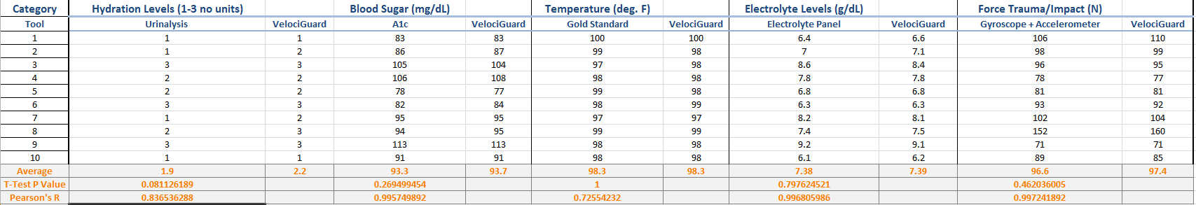 ProcedureBlood Sugar Have a test subject insert the Velociguard into his/her mouth. Take 20 minutes to measure blood sugar levels with the Velociguard and a gold standard method for blood sugar measurement (finger prick blood measurement). Take a measurement every 4 minutes. Have the test subject perform vigorous athletics for 2 hours. Take blood sugar measurements form the Velociguard and the gold standard method every 10 minutes. Take another 20 minutes as a “cool down” period. Take blood sugar measurements every 20 minutes from both the Velociguard and the gold standard method. Repeat with a minimum of 9 more subjects. H2O Levels Have a test subject insert the Velociguard into his/her mouth. Take 20 minutes to measure H2O levels with the Velociguard and a gold standard method for H2O measurement. Take a measurement every 4 minutes. Have the test subject perform vigorous athletics for 2 hours. Take H2O measurements form the Velociguard and the gold standard method every 10 minutes. Take another 20 minutes as a “cool down” period. Take H2O measurements every 20 minutes from both the Velociguard and the gold standard method. Repeat with a minimum of 9 more subjects. Temperature Have a test subject insert the Velociguard into his/her mouth. Take 20 minutes to measure the subject’s temperature with the Velociguard and a gold standard method for temperature (mouth thermometer). Take a measurement every 4 minutes. Have the test subject perform vigorous athletics for 2 hours. Take temperature measurements form the Velociguard and the gold standard method every 10 minutes. Take another 20 minutes as a “cool down” period. Take temperature measurements every 20 minutes from both the Velociguard and the gold standard method. Repeat with a minimum of 9 more subjects. Electrolyte Levels Have a test subject insert the Velociguard into his/her mouth. Take 20 minutes to measure the subject’s electrolyte levels with the Velociguard and a gold standard method for electrolyte levels measurements. Take a measurement every 4 minutes. Have the test subject perform vigorous athletics for 2 hours. Take electrolyte levels measurements form the Velociguard and the gold standard method every 10 minutes. Take another 20 minutes as a “cool down” period. Take electrolyte levels measurements every 20 minutes from both the Velociguard and the gold standard method. Repeat with a minimum of 9 more subjects.