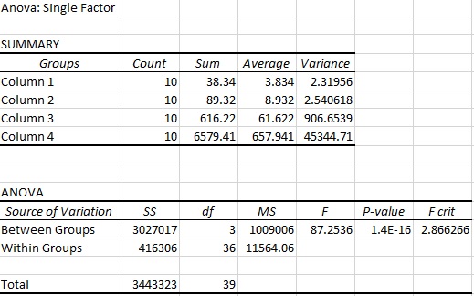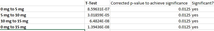 We also ran the post-test for ANOVA (seen in “Post-Test for ANOVA Data”) in which we did a t-test between every group. For the t-test for the 0 mg group to the 5 mg group, we got a value of 8.59631E-07. Seeing as this is extremely small (much smaller than our corrected p-value of 0.0125), we can infer that our data was reliable and reflected a true difference in data between these two groups. Similarly, we got a t-test value of 3.01859E-05 for 5 mg to 10 mg, 6.4824E-08 for 10 mg to 15 mg, and 1.39436E-08 for 0 mg to 15 mg, all of which are significantly less than the corrected p-value of 0.0125.