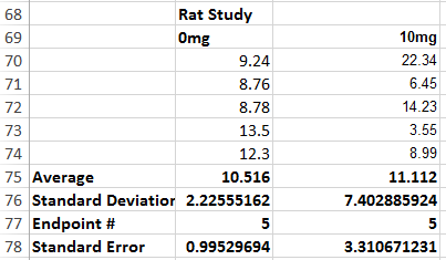 For the data analysis of the rats a t test must be run, because it properly compares the two groups of rats. Since there are two groups, rats given a 0 mg dosage and rats given a 10 mg dosage, the t test is the most suitable test to conduct to show whether or not there is a statistical difference between the two groups. The t test we ran utilized the data from the figure labeled "Data for the Rats". The values used were from the lists 0 mg and 10 mg. When the t test was conducted with the data from the rat’s production of inflammotin it yielded a p-value of .8674035. This p-value is significantly larger than a p-value of .05. Since our calculated p-value is larger than .05 the t test concludes that our data does not provide enough evidence to show a statistical difference between the two sets of data. This conclusion can be supported by the figure labeled "Graph for the Rats". As seen in this figure the averages are nearly the same with little to no differentiation. However, one thing that is a clear difference is the standard deviation of the two bars. It is clearly shown that the standard deviation associated with the average inflammotin production as a response to a dosage of 10 mg in rats is much larger than that of rats who were given 0 mg as a dosage.