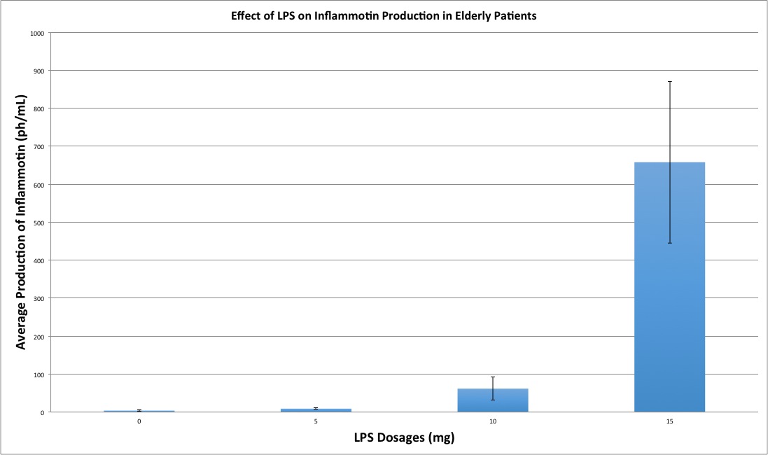 We initially took the average of each set of data and used that to find the standard deviations. We then found the endpoints to find the standard errors, as seen in “Human Data”. The standard errors are represented in the standard error bars in the “Graph for Humans” image, which also displays a large spike in average production of inflammotin from an LPS dosage of 10 mg to a dosage of 15 mg.