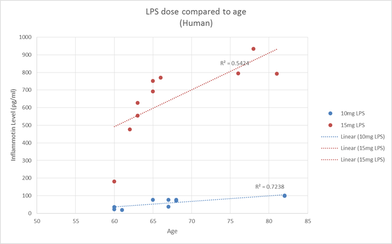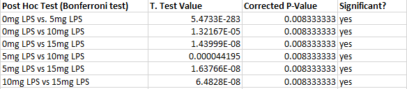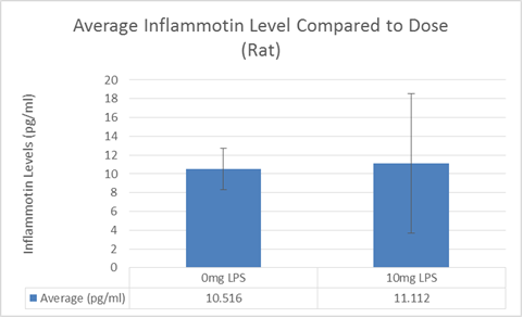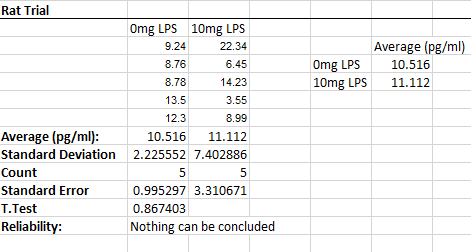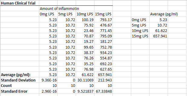 OUR TEAMLAB 2 WRITE-UPDescriptive StatisticsExperiment 1 The mean for the human experiment was 5.23pg/ml for the 0mg LPS group, 10.72pg/ml for the 5mg LPS group, 61.622pg/ml for the 10mg LPS group, and 657.9pg/ml for the 15mg LPS group. The standard deviation for the human experiment was 9.4E-16 for the 0mg LPS group, 0 for the 5mg LPS group, 30.1 for the 10mg LPS group, and 212.9 for the 15mg LPS group. Experiment 2 The mean for the mouse experiment was 10.52pg/ml for the 0mg LPS group and 11.11pg/ml for the 10mg LPS. The standard deviation for the mouse experiment was 2.22 for the 0mg LPS group and 7.40 for the 10mg LPS. ResultsExperiment 1 After reviewing the produced data from the lab, there are some very interesting results. In experiment #1, our human trial, the amount of inflammation resulting from a certain dose of LPS was being tested. The subjects who received 0mg of LPS all produced the exact same value of 5.23 pg/ml. The data also shows a similar pattern for those who were given 5mg- a resulting level of 10.72gp/ml. The pattern showed in the first two sets drastically differed in terms of the 10mg dose and 15mg dose. The 10mg dose resulted with a range of 23.46-100.19pg/ml. The average value calculated from this set is 61.62pg/ml. The 15mg dose showed a drastic range as low as 181.27 and as high as 934.23pg/ml with an average value of 657.9pg/ml. Experiment 2