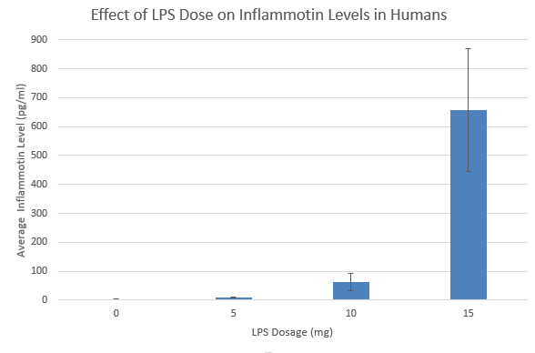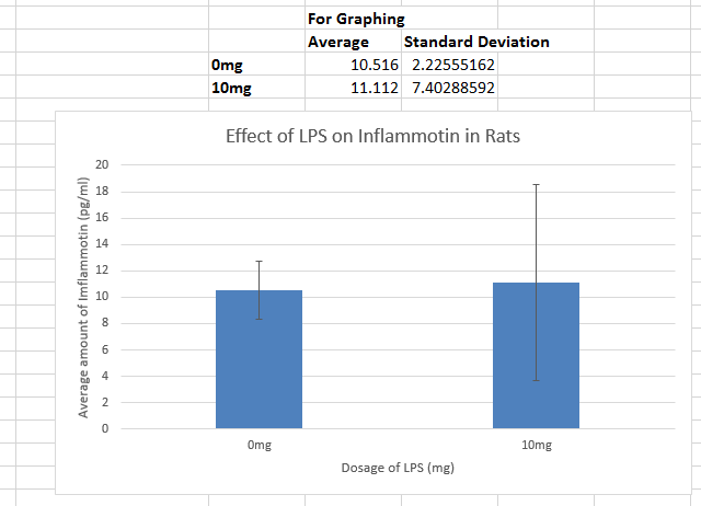 Summary/DiscussionBased on the results, the lipopolysaccharide did not have a significant impact on the amount of inflammatin present in the rats. However, in the human trials, it showed a significant difference between all four groups in the amount of inflammatin in the blood. The P-value for the rats was .87, which displays that the values had no significant differences between the inflammatin produced after different doses because the P-value was not less than .05. For the humans, the P-value was 1.4*10^-16, which is incredibly less than .05. Based on this data, the human experiment had a significant difference in inflammatin produced between the doses, while the rat experiment did not. One of the reasons why the rat experiment did not show any statistically significant differences in inflammotin levels among the different groups could be due to the fact that there might not have been a sufficient difference between the amount of lipopolysaccharide administered to the rats for each group. In addition, there were only two rat groups, as opposed to the 4 dosage groups that were tested in the human experiment. If there were additional dosage groups to compare the 0mg and 10mg rat groups to, then there might have been statistically significant differences between higher dosage groups, as was shown in the differences between higher and lower dosage groups for the human experiment. In the case that one of these discrepancies in the data collection is true, the statistically insignificant results of the rat experiment might not be the best indicator to use as a prediction for the results of the human experiment. Though the two experiments used similar methods for affecting the same dependent variable with the same independent variable, there were differences in the number of dosage groups for each experiment, which may lead the experimenters to misinterpret the relationship between inflammotin levels and lipopolysaccharide dosages. | |||||||