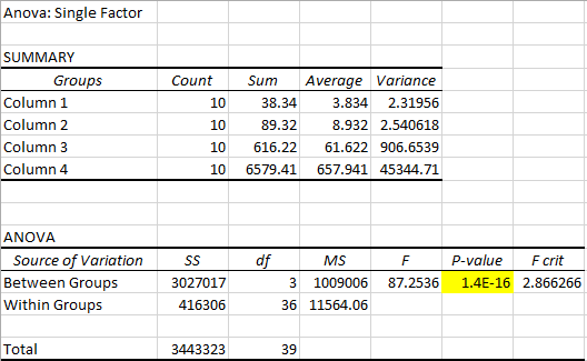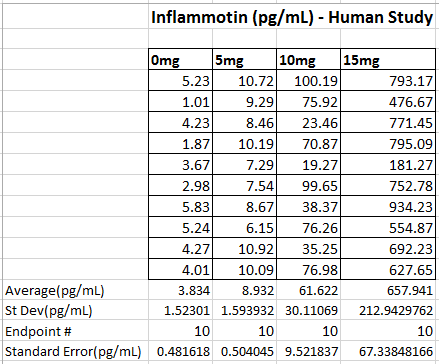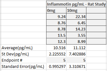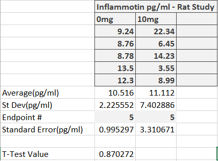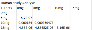 ResultsThis table reports the results from the ANOVA test that was performed on the experimental data for humans inflammotin levels of each dosage group. Based on the p-value that was calculated from the ANOVA test, the differences between inflammotin levels for each group were all statistically significant. The table above shows multiple T-tests that compare the results of two dosage groups at a time, which serves as a post-test for the ANOVA results. Since all of the p-values are less than .05, there are significant differences between all of the dosages, thus confirming that the results from the ANOVA test for the human experiment are valid. Experiment 2: Rat Test Results  The value of the T-test for the rat experiment was 0.87, meaning there was not a significant difference between the inflammotin levels in each rat group. AnalysisExperiment 1  As a post-ANOVA test, the experimenters chose to perform multiple T-tests between the groups to find out which dosages had significantly different results. All of the T-test values were less than .05, which means all dosages have significantly different results. Experiment 2