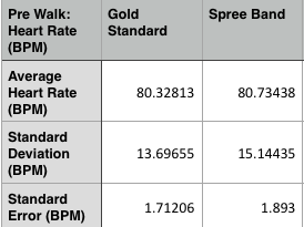 ResultsAfter performing a t-test, it was found that the p-values for temperature before, during, and after the walk were 5.57*10^-46, 4.4*10^-156, 4.51*10^-64, respectively. The fact that each value is less than the value 0.05 indicates that there is a significant difference between the average body temperatures. These small p-values mean that there is such a significant difference between the spree and the gold standard that there is almost no connection at all between the data values of the two tests. If the nominal values of the spree do in fact mean the body temperature values it says it does, then it clearly doesn't work effectively. As a way to further confirm the relationship between the gold standard device and spree band, the The Pearson's R correlation coefficient was calculated for each condition group. The Pearson's R correlation coefficients for the pre-walk, walking, and post-walk body temperatures were .089, 0.025, and -0.168, respectively. The R values for the pre-walk and walk temperatures groups both indicated a weak positive correlation, while the post-walk body temperature R value indicated a weak negative correlation between the gold standard device and spree device. This means that there are statistically insignificant correlations between the the two devices, and that the spree band is not concurrent with the gold standard device's measurement for body temperature. In regards to heart rate, the p-values were .701029 for the resting group, .47918 for the walking group, and .06193 for the cool down group. Since all of the p-values are greater than .05, the experimenter can be confident that the spree band measures heart rate accurately. The p-values for each of the heart rate group indicate that there is not a statistically significant relationship between the gold standard device and the spree band. Thus, there is evidence that the spree band is concurrent with the gold standard device measurements.