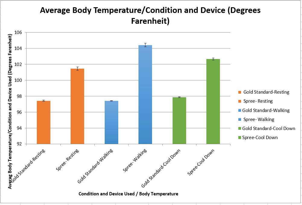 Summary/DiscussionWith the Spree band, we concluded that the temperature measurement is very inaccurate. The first reason for error is that the spree measures the temperature and displays it as 4 different levels with a range of values. These values were given degree values to use for analysis, and when using these degree conversions, we concluded that they are very inaccurate when compared to the data that we collected from the gold standard device that we used. Another error with the temperature measurement was the fact that it measures external temperature. This is what caused the inaccurate results because the external temperature is not the same as the internal temperature of the human body. The skin will vary in temperature to try and help maintain the desired internal body temperature, so the Spree band will read an inaccurate measurement.