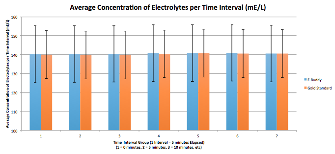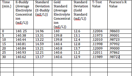 Inferential StatisticsThese inferential statistics display that the device is accurate. The T-test is above .05, which tells us that the change in the data is insignificant. Pearson's R coefficient is above .95, meaning that the data is reliable. GraphThe fact that the standard deviation error bars for each of the compared groups all overlap each other is an indicator that there is no statistically significant difference between each group. Thus, the E-Buddy head band provides an accurate measurement, since there is no statistically significant measurement from the gold standard measurement.