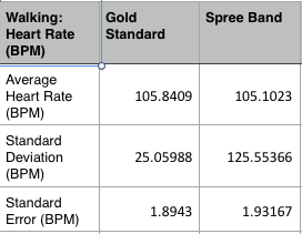 AnalysisThe data collected in this experiment clearly displays that the device is inaccurate in comparison to the gold standard for temperature. With P-values that are extremely low, and significantly different standard deviation in both heart rate and temperature, the data does not line up enough for the device to be reliable. The reasoning for these results is that the Spree gives us only four values for temperature, while the thermometer gives us a wide range of temperatures. This causes a lot of variation in the data, resulting in error. The Spree also measures external temperature (skin temperature), while thermometers measure core body temperature.The body is constantly trying to balance temperature through homeostasis, so it is likely that the temperature of the skin is different than the core body temperature. This also results in variation in temperature. Other errors that could have affected the end results of the experiment could be but are not limited to: bluetooth connection issues, human error in taking heart rate by hand, and the thermometer was not stationary while it was taking temperature of the walking subject. As for heart rate, the Pearson's R value shows that the correlation was quite high, all flirting with the value of 90%. This tells us that one could argue that the Spree is relatively reliable for the measurement of heart rate.