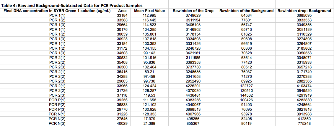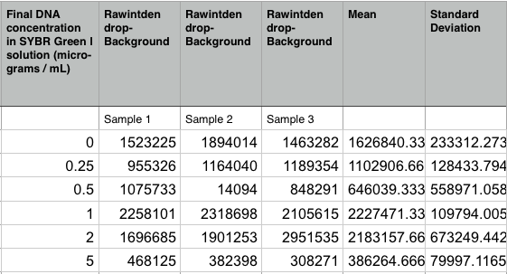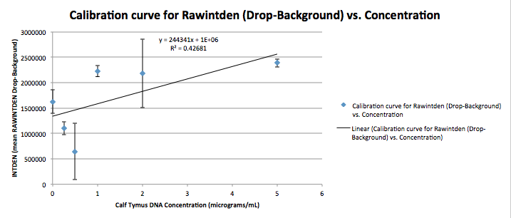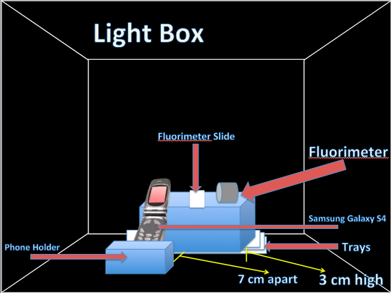 The fluorimeter was set up initially by placing it on top of several trays. The phone was adjusted properly by placing it into a phone holder 7 cm away from the base of the fluorimeter, with the camera facing the fluorimeter. To shade the fluorimeter from light, a light box was placed over both the fluorimeter and phone holder. The light box's flap was closest to the phone holder. For each calibration droplet, a fluorimeter slide was placed in the fluorimeter and 80 μL of the DNA solution was placed between the two dots closest to the phone camera on the hydrophobic surface of the slide. Then, 80 μL of the SYBR GREEN dye was added to the DNA solution until the two droplets combined to form a larger, ellipsoid shaped droplet touching the two front dots of the hydrophobic fluorimeter slide. The phone settings were adjusted accordingly (see above), the camera was focused and the timer was activated. During the 5 second timer, the flap of the light box was moved down to remove the light exposure of the droplet from the lights in the room. Once the picture was taken, the light box was removed and a micropipettor was used to remove the ellipsoid shaped droplet. The slide was then moved into the next position for the next droplet to be tested.