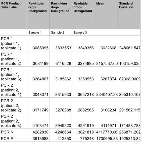 Patient 56859: An average of 9.6 μg/mL (10.7, 9.2, 8.8). This patient has a significant amount of the disease DNA, because the solution fluoresced green indicating presence of that DNA.
