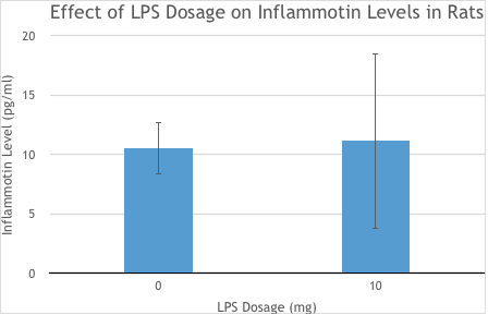 Summary/DiscussionBased on these results, there was a significant difference in protein levels for all the human tests as dosage increased. On the other hand, there was no significant difference within the rat experiment as dosage increased. Therefore, we concluded that as LPS dosage increases, inflammotin levels rise in humans and only on humans. In comparison, an increase in LPS levels in rats did not create a statistically significant change in the levels of the same protein. | |||||||