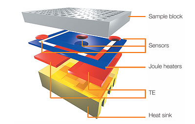 Research and DevelopmentPCR - The Underlying Technology What is the function of each component of a PCR reaction? The template DNA in a PCR reaction contains the starting sequence of nucleotides that are to be amplified. The DNA sequence is added first and denatured by increasing temperature to about 95°C. There are now two separate strands from the original DNA double helix strand. Each strand will be used for replication to amplify the desired DNA sequence. Primers are small sequences of nucleotides that have been designed in a laboratory. Their function is to find the locus at which DNA replication is to occur, and bind to that location. Because primers are manufactured, they can be manipulated to have the exact desired sequence. To ensure that they don't attach to another area on the DNA strand, a length of about 20 nucleotide is used. A total of two primers are actually used in the reaction, one for each strand of the template DNA. These primers, after pairing with complimentary bases, kick-start the DNA polymerase replication, because DNA polymerase can only attach to certain start areas in the DNA. Taq Polymerase is an enzyme that will extend the length of the primers by adding complimentary nucleotides to the primer. This particular type of polymerase is used because of its heat tolerance, which can withstand well above 72°C, which is temperature that will allow extension but not annealing. Deoxyribonucleotides (dNTPs) are part of the basic units of DNA. There are four "bases," which are marked A for adenine, T for thymine, C for cytosine, and G for guanine. These four bases form sequences that translate as code and meaningful information in DNA. What happens to the components during each step of thermal cycling? Initial Step: 95°C for 3 minutes: Template DNA is denatured so that two strands result from the initial double helix. Denature at 95°C for 30 seconds: DNA denaturation is ensured so that the DNA strands will not reform. Primers will have been added by this point. Anneal at 57°C for 30 seconds: Two primers will bind will top and bottom strands of DNA, keeping the two strands separate while preparing for replication. Extend at 72°C for 30 seconds: Taq polymerase will have been added at this point, and will begin assembling the new DNA sequence from the two primers. At this temperature, no more annealing can occur, but DNA replication can, due to Taq's properties. Final Step at 72°C for 3 minutes: Full extension of the DNA sequence is ensured. Final Hold at 4°C: Newly formed sequences are allowed to solidify bonds and strengthen their hold on individual nucleotides. Base pairing A (adenine) pairs with T (thymine) C (cytosine) pairs with G (guanine) During which steps of thermal cycling does base-pairing occur? Annealing: primers attach to the two strands of DNA, pairing to a matching sequence in the template DNA. Extension: Taq polymerase brings over nucleotides, extending the primers and pairing them in order of the DNA sequence.