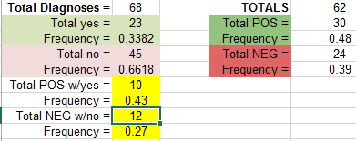 LAB 6 WRITE-UPBayesian StatisticsOverview of the Original Diagnosis System From the DNA test of a disease-associated SNP, a Bayesian calculations were done in order to determine probability of an accurate diagnosis. The division of labor was 34 teams averaging around 6 students each that diagnosed 68 total patients. Each patient was tested for a positive or negative reading, which was then compared to a positive or negative control. In this way, accuracy was tested. In order to further prevent errors, 3 trials per patient were run, to ensure proper reading. Two PCR controls, one positive with DNA in it and one negative without any DNA, were utilized to provide a benchmark for ImageJ pixel comparisons. Within ImageJ itself, the pixels were calibrated to match the drop size used in the measurement. Finally, three pictures of each trial were taken in order to give a more accurate reading of the drop. The following Bayesian calculations were done using the results shown below. The equation used to calculate probability of reading accuracy was: P(A|B)=(P(B|A)*P(A))/P(B) P(A|B) is the Probability of A given B P(B|A) is the Probability of B given A Probability of positive final test conclusion given a positive PCR reaction A=.48 B=.49 P(B|A)=.89 P(A|B)=.87 Probability of negative final test conclusion given a negative PCR reaction A=.39 B=.39 P(B|A)=.77 P(A|B)=.77 Probability patient will develop disease w/ positive final test conclusion A=.34 B=.48 P(B|A)=.43 P(A|B)=.30 Probability that a patient will not develop disease w/ negative final test conclusion A=.66 B=.39 P(B|A)=.27 P(A|B)=.46 What Bayes Statistics Imply about This Diagnostic Approach