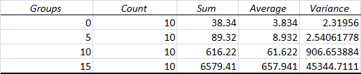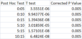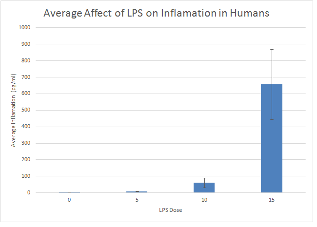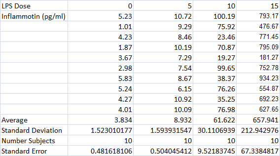 One-way ANOVA Bonferroni ResultsExperiment 1:Humans  When given a 0mg dosage of LPS, the average inflammotin produced was 3.834pg/ml with a standard deviation of 1.523 and a standard error of .4816. When given a 5mg dosage of LPS, the average infammotin amount produced was 8.932pg/ml with a standard deviation of 1.5939 and a standard error of .504. When given a 10mg dosage, the average inflammotin amount produced was 61.622pg/ml with a standard deviation of 30.1107 and a standard error of 9.5218. When given a 15mg dosage, the average protein amount was 657.941pg/ml with a standard deviation of 212.943 and a standard error of 67.338. For the Bonferonni post hoc test, the p-value that we set as our standard was .00083. Our 0 to 5 mg comparison yielded a .000003555 t test value, 0 to 10 yielded .000009944, 0 to 15 yielded .000000014, 5 to 10 yielded .000030186, 5 to 15 yielded .000000016, and 10 to 15 yielded .000000065. All of these values were less than .00083, making our statistics statistically significant.