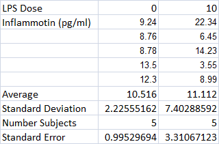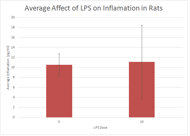 The first 5 subjects were given 0mg of LPS as a control resulting in an average inflammation of 10.516 with a deviation of approximately 2.226 resulting in a 0.995296941 standard error. The second set of subjects (5 rats) were given a 10 mg dosage of lipopolysaccharide, these tests showed an average inflammation of 11.112 which is 0.596 greater than the average of the 0mg subjects. In the 10mg group there was a standard deviation of 7.403 between inflammation level readings, the standard error in readings was 3.311. When the t test was conducted the resulting t test value was 0.8674, which points out the probability that the differences will occur if we ran the experiment again. The bar graph shows that the effect of LPS dosage on the two subjects does not differ with an amount more than one, thus the effect of LPS from 0 to 10mg dosage on rats is not as strong as it is on humans.