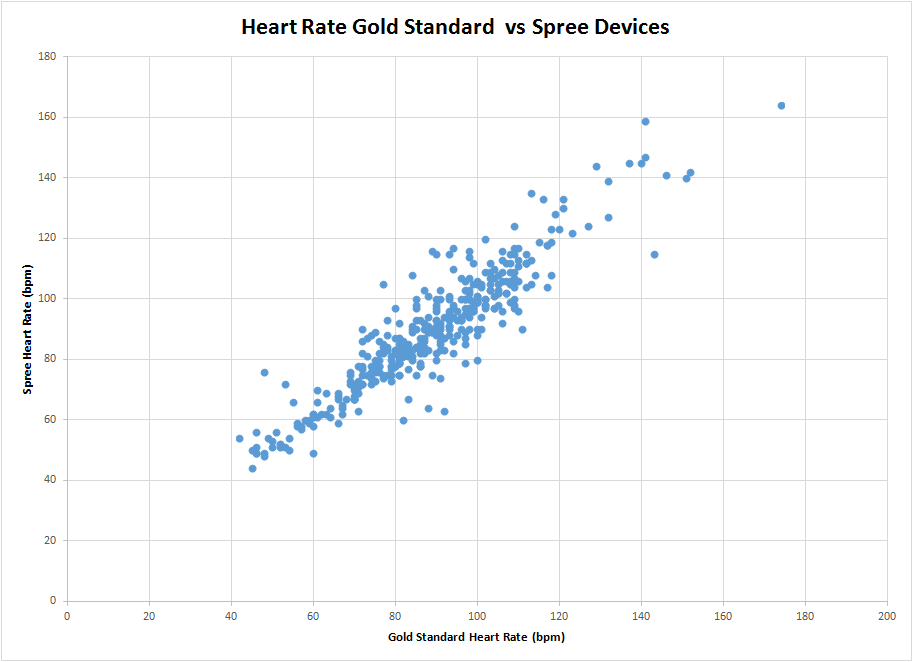 AnalysisTemperature Temperature was measured by using two different devices, the spree device and a gold standard thermometer. After doing the experiment the standard deviation for the spree device was recorded at 2.990542973; the thermometer was recorded at 0.861960346 and the total standard deviation was 3.672822743. By using these data values, a T-test was performed for these devices and a p-value was recorded at 8.3911E-259, which is much less than 0.05, which leads to the conclusion that the spree device is not accurate in recording temperature. The Pearson's r-value for these devices was calculated and was recorded at -0.016973185, which creates a negative correlation not close to one, which, if close to one, would validate the device's reliability in accurate temperature measurement. By analyzing the data it can be concluded that the spree device was not accurate because the p-value for this device was less than 0.05 and the Pearson's r-value was not close to 1. Heart Rate Using a pulse oximeter as the gold standard and the Spree device, heart rate was monitored throughout the experiment as the test subject performed light exercise. The results indicated that the Spree sensor did a fine job recording accurate heart rate of the subject. With a golden standard deviation of 21.12752 and a Spree standard deviation of 21.46775, results between the two did not vary by much. Upon utilization of the Pearson's r test, where -1, 0 and 1 represent correlation between data sets, an r-value of 0.90 was ultimately reached. An r-value of 0.90 suggests a positive correlation between the data, which solidifies the conclusion that the Spree device accurately measures heart rate.