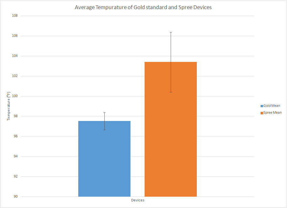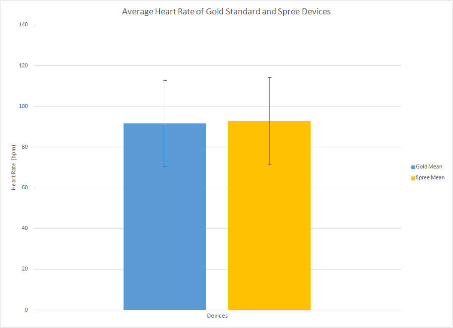 ResultsResults on Temperature: Results on Heart Rate: The mean of all the gold heart rate values was calculated to be 91.67832, the gold heart values have a standard deviation of 21.12752 and a standard error of 0.790124. As for the mean value of the spree value it was calculated to be 92.82278, the spree value had a standard deviation of 21.46775 and a standard error of 0.814318. The total combined mean for both spree and gold standard data was 92.21529 resulting in a combined standard deviation of 21.29549 and a total standard error of 0.567124. The Pearson's r-value for the gold standard data was 0.897446 and the t-test value was 0.325314. The presented calculated results above shows a strong relationship between both spree heart rate values and gold standard heart rate values, for example, the mean of the gold standard data values was 91.7 and the mean for spree values was 92.2, they are relatively close to each other. The difference between standard error of the readings was about 0.01 which is fairly low giving the Pearson's r-value a value of 1, which indicates strong linear correlation, thus when the gold standard heart rate values increase, spree heart rate values increase as well to a relatively close amount. At last, the t-test value showed how close the values were to each other.