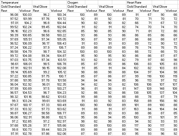 Heart Rate Heart rate is yet another vital measurement taken by the Vital Glove. To test the Vital Glove’s effectiveness, it was compared to the gold standard device for heart rate measurement. Multiple measurements were taken using both devices at intervals in which subject is both resting and exercising. These values were collected and a T-test was run to gather inferential statistics comparing the two devices. The resulting T-test obtained a value of .981846589, which is close to 1. This means that the data set values are highly comparative. Likewise, a Pearson’s r-value was obtained at .999203348, which again is very close to 1 and shows a strong correlation between the two products. According to this data, it is clear that the Vital Glove is highly effective in its measurement of heart rate and is similar in validity to the best gold standard devices. GraphTemperature