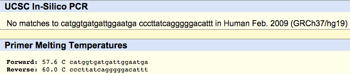 The image below shows the UCSC In-Silico PCR website results for the non-disease forward primer and non-disease reverse primer.