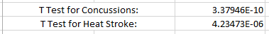 Figure 4: T-test results for temperature results form the spree headband and the gold standard. Small values for the p-value mean that the correlation between the variables under investigation rarely occurs.The T-test for temperature shows a extremely small p-value also implying that reliable and valid results for temperature cannot be obtained from the spree headband.