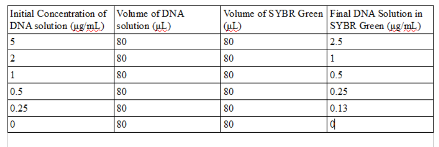 Next, 80 microliters of SYBR Green I solution was micropipetted onto the slide in the middle of the first two rows. Then 80 microliters of the calf thymus or water blank solutions were added to the drop. Once the drop was pinned on the slide, the slide was adjusted so that the blue LED light was focused by the drop onto the fiber optic fitting on the other side of the drop. The timer on the group's camera could not take a picture without creating a flash, so one team member had to take pictures with their hand inside the light box, preventing as much light as possible from entering and interfering with the image. Three images of each drop were taken. The pipettor was used to remove all 160 microliters of solution from the slide, and the procedure was repeated for each concentration of calf thymus DNA given by the instructions. In continuation of the PCR reactions which were set up in part B, the PCR samples were obtained and measured using the fluorimeter.  The micropipettor was set to 120 microliters and all 100 microliters of PCR sample were transferred into the tubes which contained buffer solution.  This procedure was followed for the rest of the PCR sample tubes as well.  Next, 80 microliters of the PCR solution which had been diluted by the buffer solution was pipetted onto a slide, along with 80 microliters of SYBR GREEN I, and again, three images of each drop were captured.  All tubes were disposed of in hazardous waste bags, and equipment was returned after fluorimeter analysis was finished.