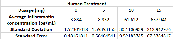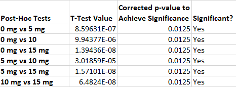 AnalysisExperiment 1 - Rat Testing In the rat study the p value of 0.419533952 is greater than 0.05, therefore, there is no statistical difference between the rats who receive 10mg and the rats who receive 0mg. This might have happened due to the small number of subjects and low variation of dosage values administered. Experiment 2 - Human Testing In the humans' study there was a statistical difference between humans who took 0mg, 5mg, 10mg and 15mg dosages as indicated by the t-test values, which were all under 0.0125, the corrected p-value to achieve significance.
