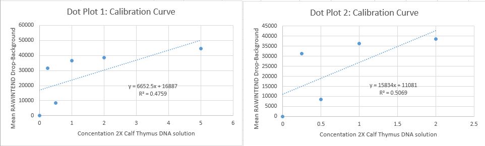 | Initial Concentration of 2X Calf Thymus DNA solution (micrograms/mL) | Final DNA concentration in SYBR Green I solution (µg/mL) | Sample Number | RAWINTDEN DROP - BACKGROUND | ' | ' | MEAN | Standard Deviation |