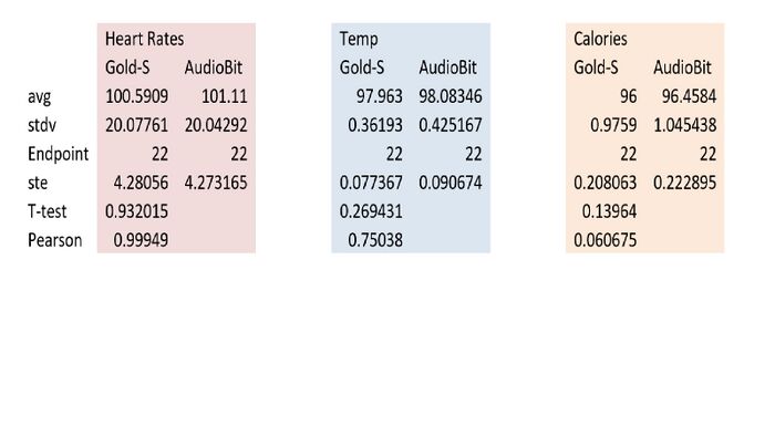 Inferential StatisticsPearson product moment correlation coefficient for the data sets of temperature (gold standard, spree band) in pre-walk, walk, and cool down. Pre-Walk: 0.066284 (No Correlation) Walk: 0.212313 (No Correlation) Cool Down: -0.00362 (No Correlation) Pearson product moment correlation coefficent for the data sets of heart rate (gold standard, spree band) in pre-walk, walk, and cool down. Pre-Walk: 0.67505 (Positive Correlation) Walk: 0.900656 (Positive Correlation) Cool Down: 0.434971 (No Correlation)