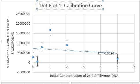 | Initial Concentration of 2X Calf Thymus DNA solution (micrograms/mL) | Final DNA concentration in SYBR Green I solution (µg/mL) | Sample Number | RAWINTDEN DROP - BACKGROUND | ' | ' | MEAN | Standard Deviation |