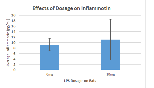 Summary: The study and experiments show that as as the amount of LPS was increased in both study subjects, the inflammation levels also increased. In regards to the Rat experimental group, as the dosage was increased from 0 mg to 10 mg, the average inflammation levels in all of the subjects also increased (from an average of 9.24 pg/ml to 11.112 pg/ml). For the human test subject counterparts, similar results concurred with the data received from the rats. As the dosage was slowly increased in humans, from 0 mg to 5 mg to 10 mg and finally to 15 mg, the inflammation levels increased exponentially. Also, our one factor ANOVA test and unpaired t test came up with a value greater than 95%, which means that the data is statistically significant in both studies. Overall, a positive correlation and possible causation of LPS being positively correlated with Inflammation levels in both humans and rats is noticed.| Post-hoc Tests | t-test value | Corrected p-value to achieve significance | Significant? |