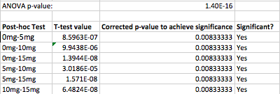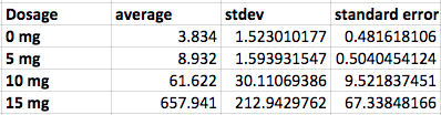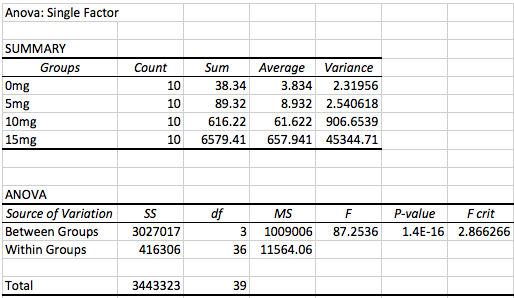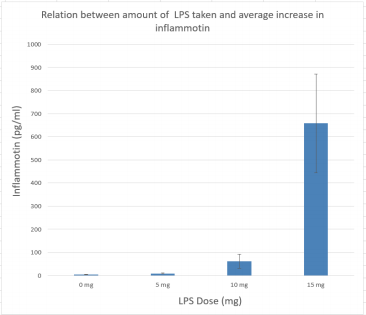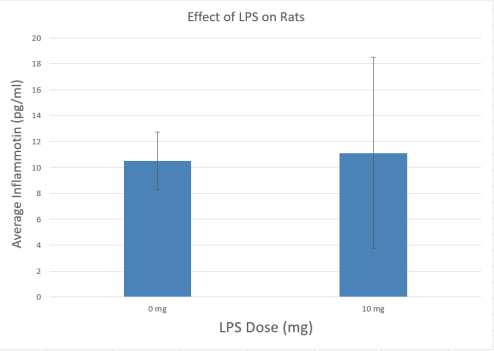 Based on the data we encountered it has become evident that the greater the dosage of LPS the greater the inflammotin in both the human study and the rat study. At 0mg of LPS the average inflammotin was 3.834. At 5mg of LPS the average was 8.932. At 10mg of LPS the average was 61.622 and at 15mg of LPS the average inflammotin was 657.941. In these human study results we can see the increase of one causing the increase of the other. The same relationship is shown in the rat study. As the value of the LPS dosage increases the inflammotin proteins in the body increase as well. Based on the p level at 95% confidence being less than the critical value this means that the known hypothesis will be rejected meaning there is a significant difference between each dosage and their corresponding inflammotin concentration.