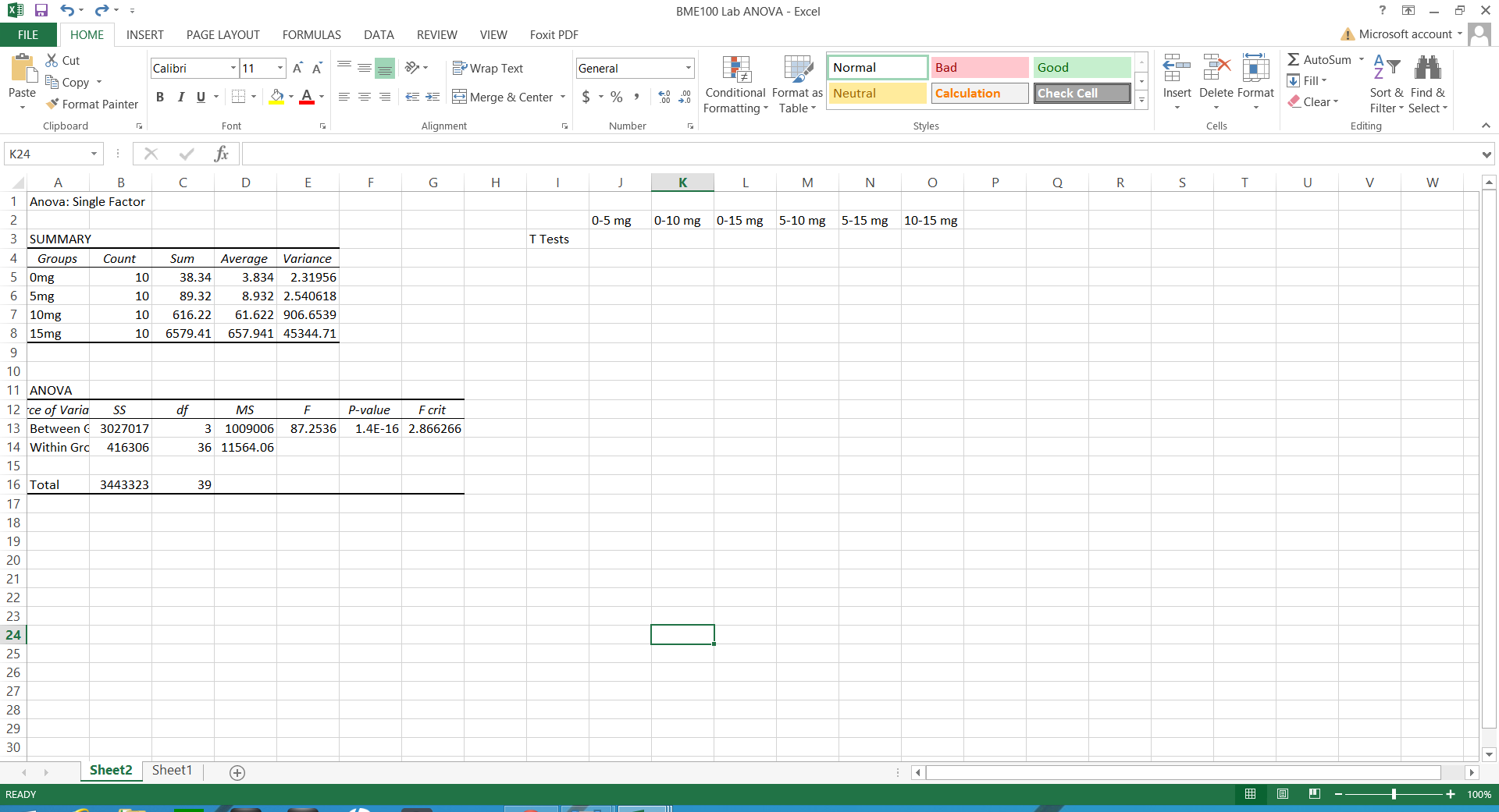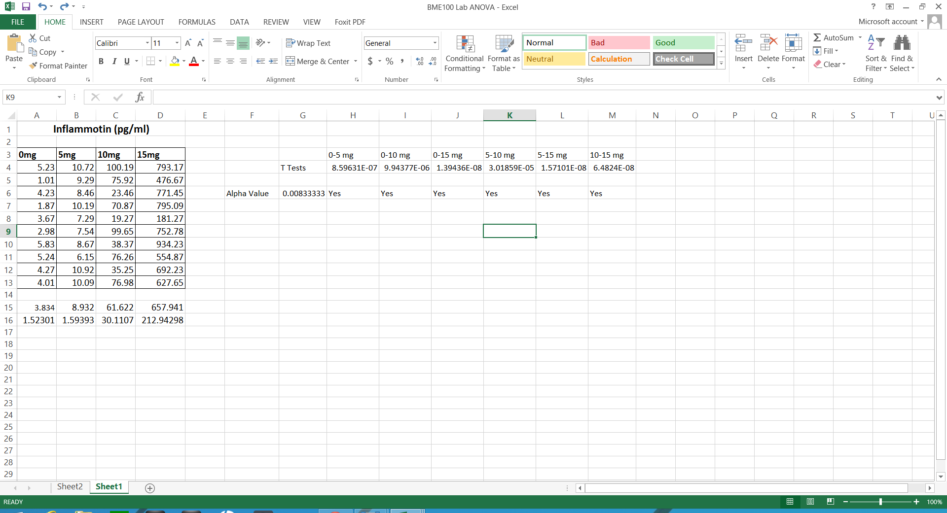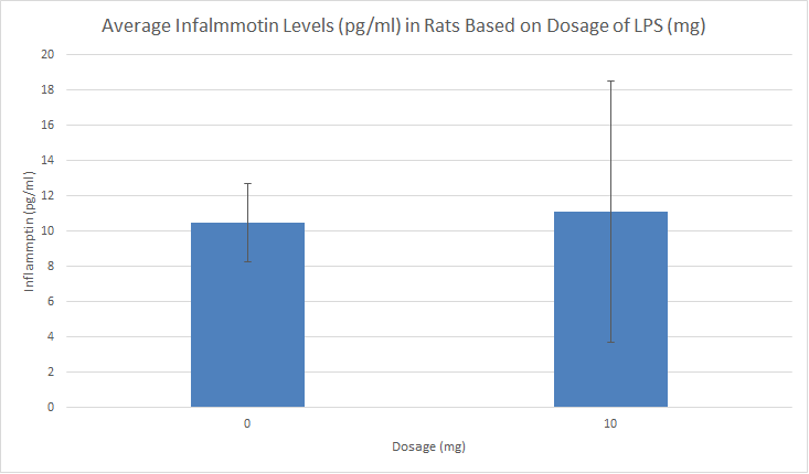 Summary/DiscussionEach data set involved different tests of inferential statistics in order to determine the statistical difference. In the study on humans, the average inflammation levels per dosage are as follows: 0mg=3.834pg/ml (Standard Deviation-1.523; Standard Error-0.482), 5mg=8.932pg/ml (SD-1.594; SE-.504), 10mg=61.622pg/ml (SD-30.11; SE-9.522), and 15mg=657.941pg/ml (SD-212.9; SE-67.34). In the rat study, the average inflammation levels per dosage are as follows: 0mg=10.516pg/ml(SD-2.226; SE-.0.995), and 10mg=11.112pg/ml(SD-7.403; SE-.3.311). For the rat results, a T-test was used because it compares two sets of data and there were only two averages in the data set. There is no statistical difference in this data because the p-value (.87) is greater than .05. If the p-value was less than .05, then there would be at least 95% confidence that there was statistical difference. However, there is only about 13% confidence. The ANOVA test investigates differences among several groups of data, so this was implemented in the human results. There is a statistical difference between data sets because the p-value of the ANOVA test is 1.4e-16. There is nearly 100% confidence that the data is statistically different. Included with the ANOVA test was a post-test to determine if each comparison is statistically different. The Bonferroni Correction is .0083 and all of the t-test values are less than this number, so the data is statistically significant. While there was no statistical difference of the average inflammation levels of rats, there is a very clear statistical difference in humans. In the humans, as the dosage of LPS increased, the inflammation levels also increased. Kristen believed that the rats would also follow this correlation, and the increase in the average level of inflammation might be proof. However, it cannot be used to prove anything because there is not nearly enough confidence that the same results will occur again. | |||||||